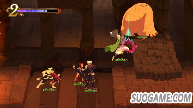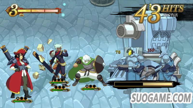 RPG的战斗模式特别直观,用按键来区分角色,每个角色对应一个按键,攻击和防御都由这个按键控制。这种模式可以追溯到早期一些经典的RPG作品,在兼顾多角色与按键分配的前提下,这是一种用于控制攻防交换的中庸设定。通篇游戏的战斗都保持了极快的节奏,你需要把持住各个角色的攻击顺序以保证打出更高的连击数,这关乎到伤害的上限。而因为双方都在流动的时间中轮序行动,所以特别多时候会有强烈的“不动就亏了”的感觉。值得注意的是,这种紧张感并没有抬升游戏的难度,以至于你可以在一些不重要的战斗中放弃策略而胡乱点按。