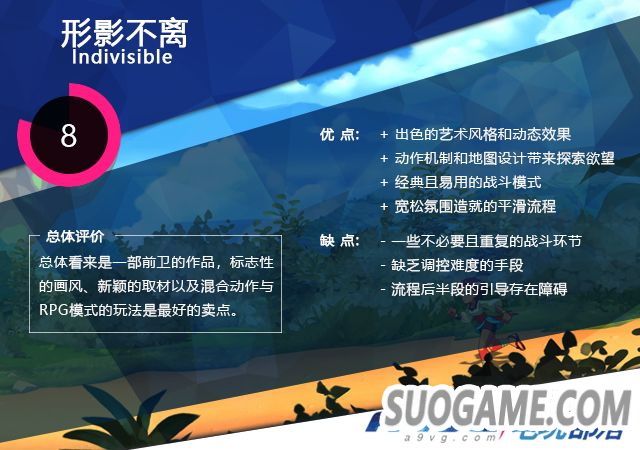 《形影不离》标志性的画风带来良好的第一印象,混合动作与经典RPG模式的玩法则是一个独特的卖点。尤其关于玩法,在探索、动作与战斗环节的结合部分作出特别多努力,无论哪个环节都有值得褒赞之处,抵消了其中某一方面过于突出的单调感。当然,博采众长是一柄不太好控制的双刃剑,正因为东西多,所以也需要在各方之间找到平衡。换句话说,它特别难把其中某一部分、尤其是战斗环节做得特别深,这是力所不能及的地方。在战斗体验给你造成困扰之前,它将一直保持强劲的吸引力。