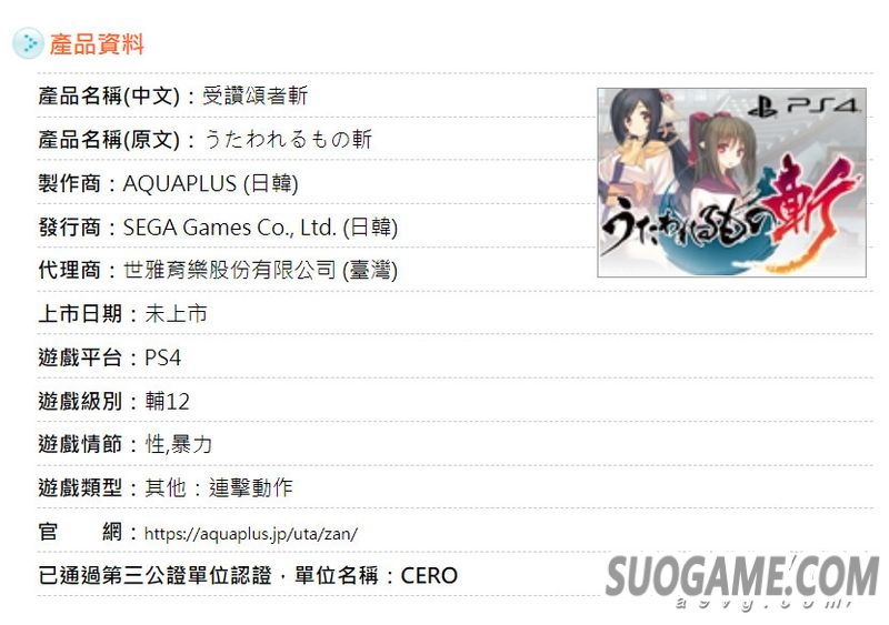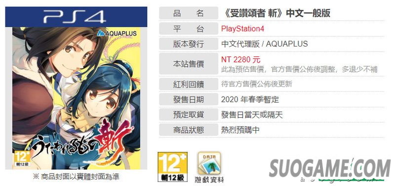 巴哈姆特商城上架PS4《传颂之物 斩》(官译:受赞颂者 斩)的中文版商品页面,其中显示这款游戏的中文版暂定于2020年春季推出。根据台评级信息,这款作品的中文版依旧由SEGA代理发行。