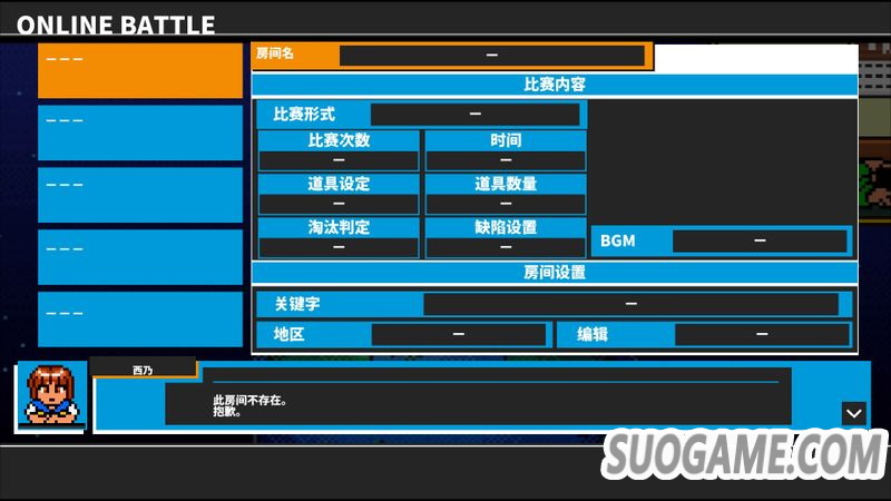 联网模式算得上是一大重心,在线上对抗的环节上,本作并没有对以往的基础进行改动,几项常规的选择“快速匹配”、“创建房间”以及“搜索房间”皆完整地进行了保留,经过几番尝试后,截至发稿之前在线上可以匹配到的玩家依旧是凤毛麟角,你不能说完全没法匹配到,包括搜索、连接等一系列同步的流程中经常会出现一些错误导致联机失败,结果就是又要重新开始一段搜索,不过当一切正常链接之后,游戏的网络服务还算是可圈可点的,整体战斗还算得上相对流畅,不过前提依旧是你可以找到那些愿意和你一样一同频繁刷新这空空如也列表的玩家。