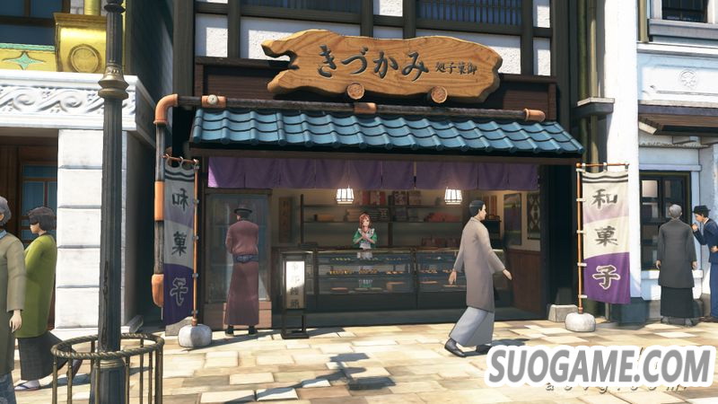 路面电车停留的车站地区。道路的另一侧并排着日式点心店及书店等店家。
