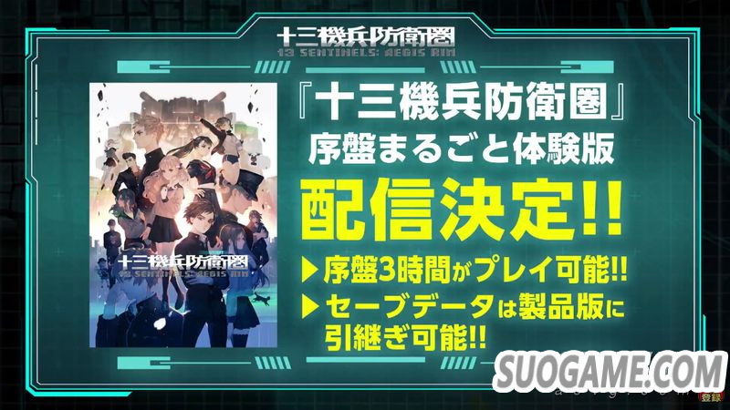 同时官方还宣布将要在10月推出《十三机兵防卫圈》的试玩版,预计将要在10月内推出。试玩版可以游玩整个序章,大概有三个小时的内容,并且正式版将可以继承试玩版的存档。本作预计将要在2019年11月28日推出,平台PS4。