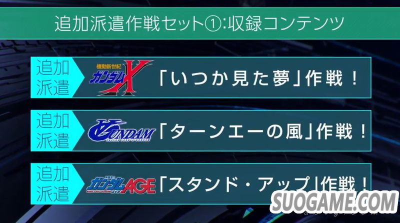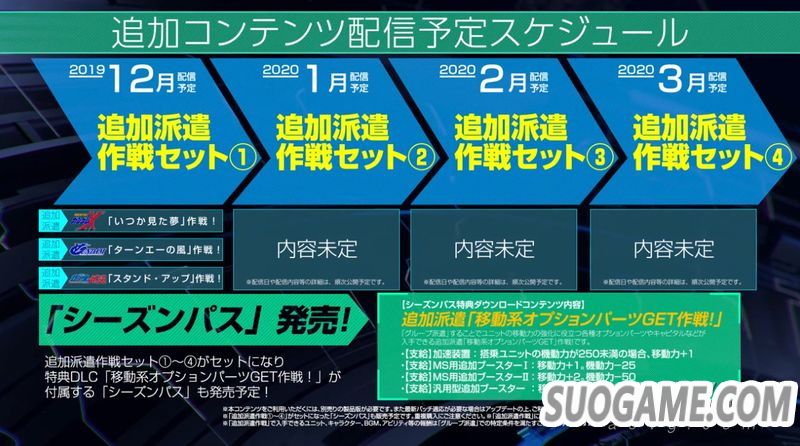 另外,本作确认推出DLC,12月追加《机动新世纪高达X》《机动战士高达逆A》《高达AGE》相关派遣任务,执行小队派遣后可获得新机师、机体、BGM、技能等。2020年1月至3月每月都将推出新DLC。届时也将推出季票,购买季票将获得特典任务及配件。