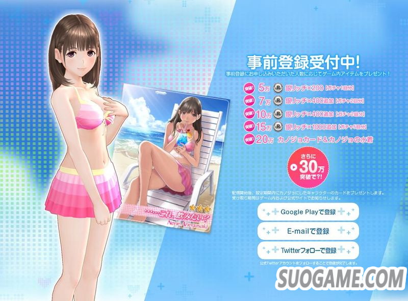 同时,根据提前登陆人数的不同,获得的奖励也将不一样。超过5万将送200银币(抽卡一次)、超过7万追加400银币(抽卡两次)、超过10万追加400银币(抽卡两次)、超过15万追加1000银币(抽卡五次)、超过20万赠送女朋友卡片与女朋友的泳衣。