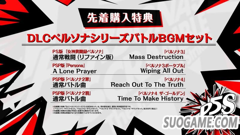 随后游戏在官网上公开了一些截图以及各种特典情报。本作的首发特典为《女神异闻录》历代战斗BGM包;限定版则包含豪华包装盒、设定资料集、手绢、包、原声CD、主题曲花絮影像BD、游戏软件。