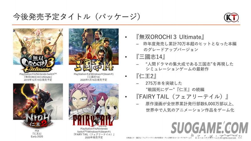 ·未来将要推出的主要作品有《无双大蛇3U》《三国志14》《仁王2》《妖精的尾巴》,还有协助开发的《女神异闻录5S》。