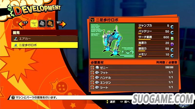 另外根据YouTube用户DBZanto Z的消息,《七龙珠Z 卡卡洛特》将会加入原作中的多种载具以便玩家使用。图片中透露了玩家可以通过在游戏世界中找到的素材交给布玛来开发悬浮车或双足步行机甲,之后还可以进行各种强化。驾驶载具还可以参加时间挑战,玩家需要在规定的时间内穿过数个检查点,最终到达目的地后即可完成挑战。此外玩家还可以利用双足步行机甲在大地图上寻找各种各样的素材。