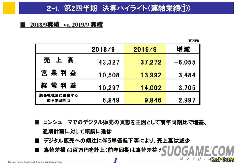 CAPCOM公布19-20财年Q2财报,上半年累计营业额372.72亿日元同比减少14%,营业利益139.92亿日元同比增长33.2%,虽然减收但是增益,实现历史最高收益。