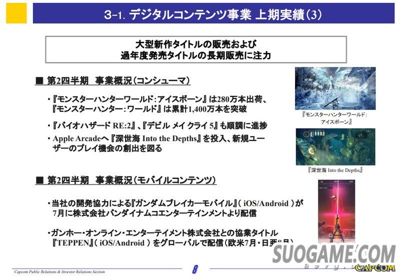 Iceborne》全球出货280万份(首周公布销量是250万),《怪物猎人世界》累计则突破1400万份。另外《生化危机RE2》《鬼泣5》等游戏也持续热销为收益带来贡献。