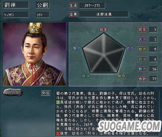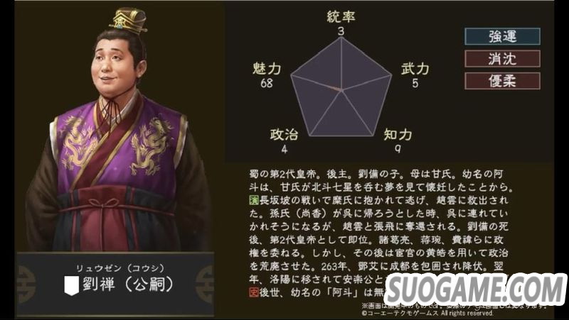 其中刘禅的数值优点意思,其实这并不是他真实能力的反映而是一个梗。他的5围分别是3、5、9、4、68,其中3594在日语中是三国志的谐音,6+8等于14,正好点题。