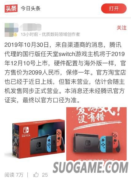 昨日(10月30日)今日头条有自媒体爆料了关于国行任天堂Switch的最新信息:“来自渠道商的消息,腾讯代理的国行版任天堂Switch主机将于北京时间2019年12月10日上市,硬件配置与海外版一样,官方售价为2099人民币,保修一年。官方淘宝店也已经于近日上线,但暂未营业,估计会随主机发售同步正式营业。本消息还未经腾讯官方证实,最终以官方口径为准。”
