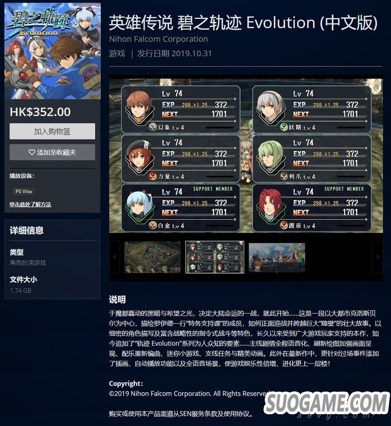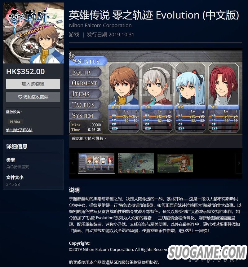 港服PS商店突然上架PSV《英雄传说 零之轨迹EVO》和《英雄传说 碧之轨迹EVO》的中文版,今天10月31日发售,价格各352港币。
