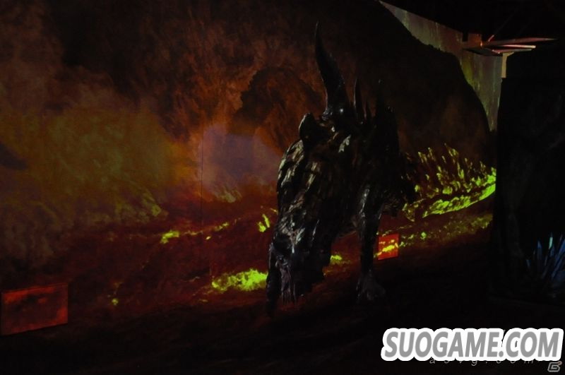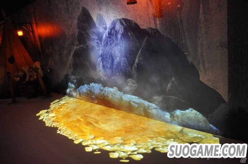 首先是《怪物猎人》系列中5个场景的体验区域,分别是森林、沙漠、火山、海、雪山。在这里不光是环境影像,连声音和味道都能感受,此外还有不少可以互动的要素。