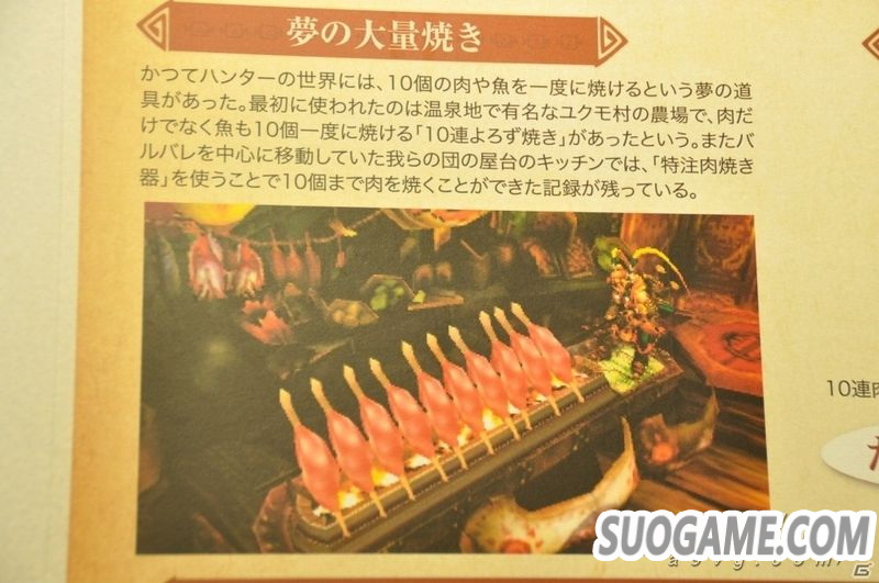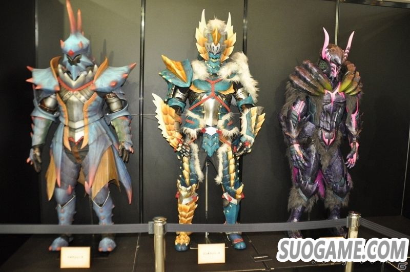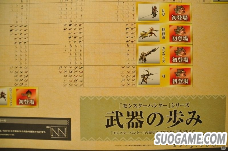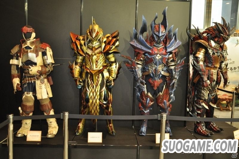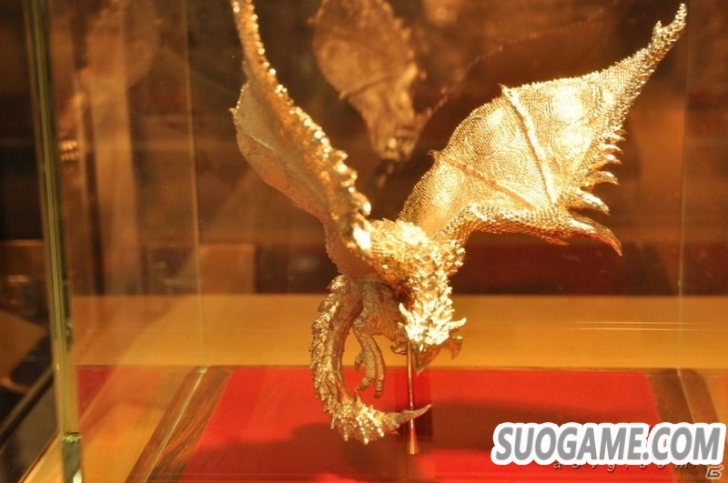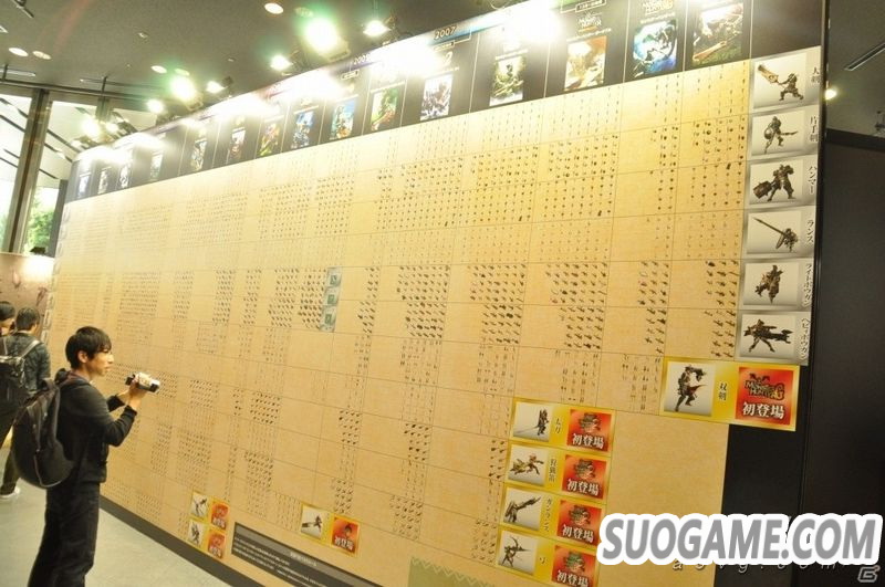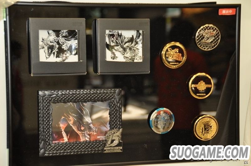 而在展示区域,包含了大量设定资料和怪物比较影像等。首先是一些历代主要装备的实物展示。