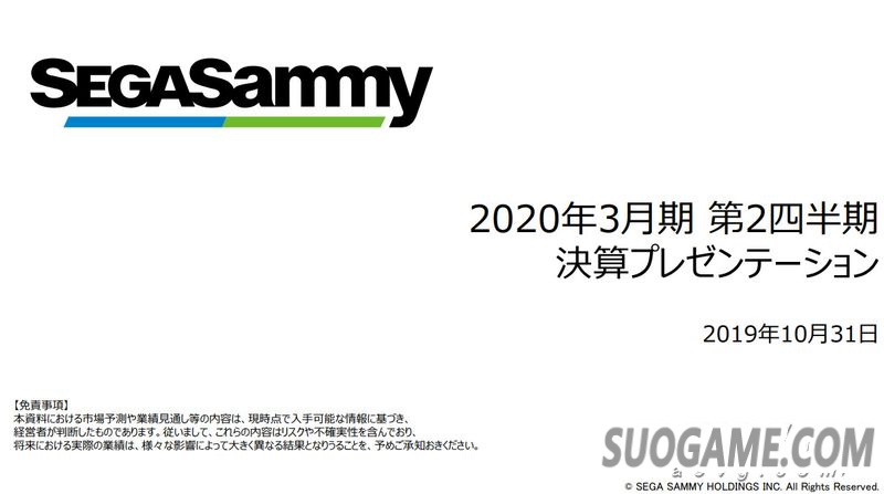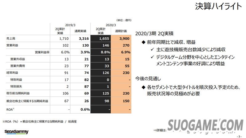 SEGA SAMMY公布19-20财年上半年财报。营业额1655亿日元同比减少3.2%、营业利益146亿日元同比增长43%,减收但增益,整体情况良好。