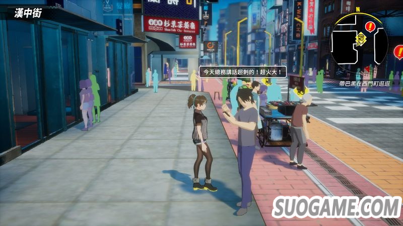 本作在背景设计上极力地以卡通的形式对西门町进行高度还原,事实上以游戏呈现的高楼林立的建筑群也能看出个一二,从耸立的高楼到喧闹的人群,西门町热闹的景象被完整地体现了出来,只是比较美中不足的是游戏中的西门町虽然路人和一些比较经典的设施都有所还原,但因为路人之间更多的只是以一种摆设的形式出现,你从其身旁路过可以看到他们口中对于当前状况的评价,但也仅限于此,现实的世界里主角可以互动的角色,除了支线和路边摊位商店的NPC外便没有了可以对话的对象,以游戏的广度而言,尽管人流攒动车水马龙,但依旧还是显得有些死气沉沉,但若是以点缀的角度去看待,还是相当可圈可点的。