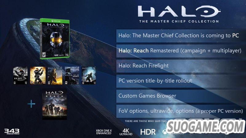 《光环 士官长合集》已在2014年11月11日登陆Xbox One平台,支持中文。本作的PC版将收录《光环 致远星》、《光环 战斗进化 周年版》、《光环2 周年版》、《光环3》、《光环3 地狱伞兵》、《光环4》这几部作品。PC版将支持以单作的形式进行购买,每作售价10美元(《光环3 地狱伞兵》售价5美元),此外《光环 致远星》也会添加到Xbox One版《光环 士官长合集》中。