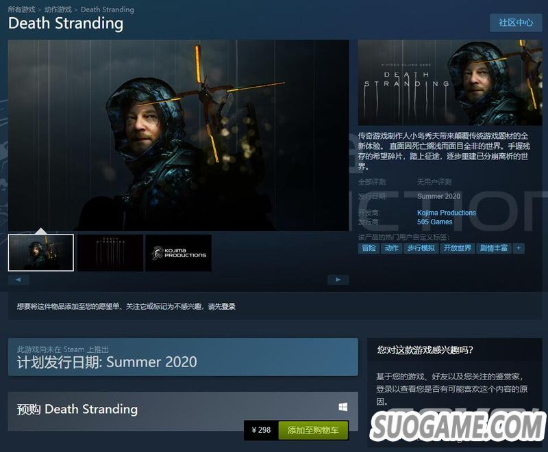 继上周505Games宣布将发行小岛秀夫(Hideo Kojima)新作《死亡搁浅》(Death Stranding)的PC版本后,全球发行商505Games表示游戏将要在2020年夏季同时发售于Epic Games平台与Steam平台。PC版本的《死亡搁浅》(Death Stranding)预购现已开启,基础版价格为59.99美元,国区价格为298元人民币。