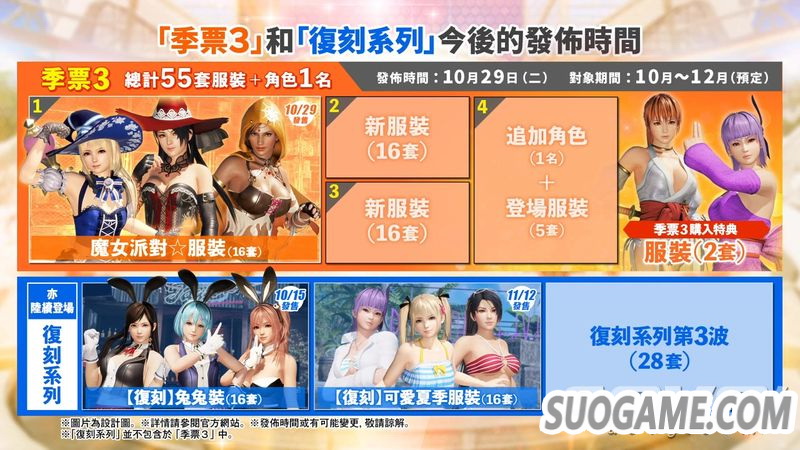 《死或生6》公开新DLC服装“复刻可爱夏季服装”的演示影像。该DLC为《死或生5LR》同名泳装的复刻版,今天11月12日上架,定价单件220日元,全套16件2200日元。