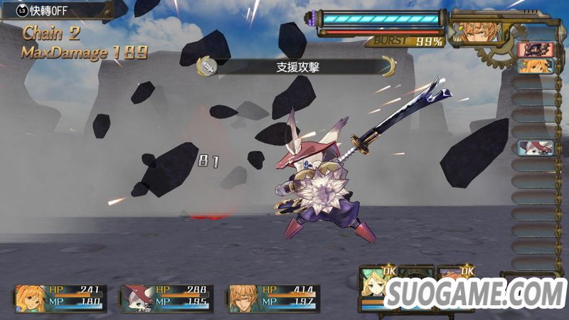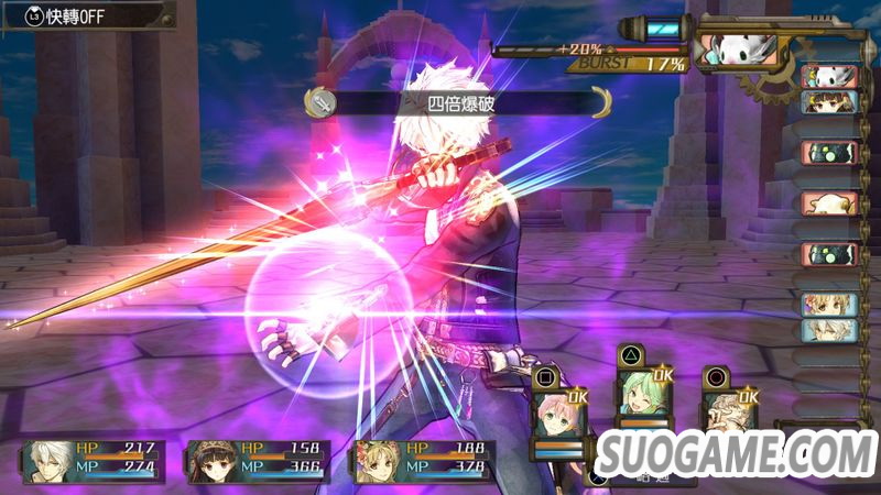 随着战斗中的行动,右上角的爆发量表将会上升。集满之后便可发动爆发模式,对敌人造成的伤害将会增加,辅助量表将更容易累积之外,也可使用特殊的连携技和必杀技。爆发模式中可连续进行助攻,第3位助攻将会发动超强力名为终极攻击的特殊连携技! 此外,必杀技量表达到MAX的话便可使用强力的必杀技!