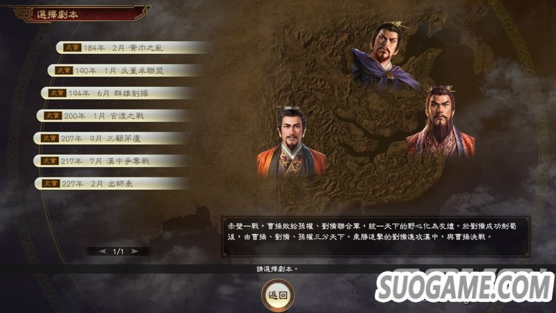 本作共有7个剧本,玩家可以从揭开战乱序幕的「184年2月 黄巾之乱」、曹操与袁绍相互争夺霸权的「200年1月 官渡之战」、诸葛亮发动北伐的「227年2月 出师表」等剧本中,选择喜欢的剧本进行游戏。活跃于该时代的英杰都会在各个剧本中登场,玩家可以从这些个性丰富的群雄当中,选择其中一个势力进行游戏,依照选择的势力不同,统一中华大地的游戏方式也会变化。