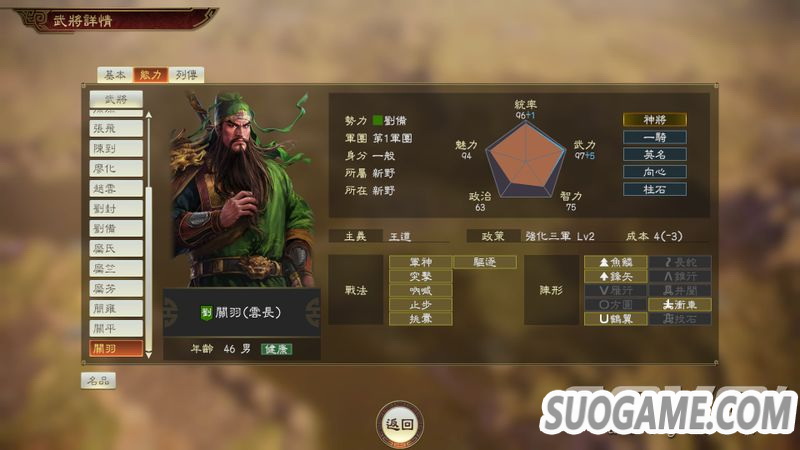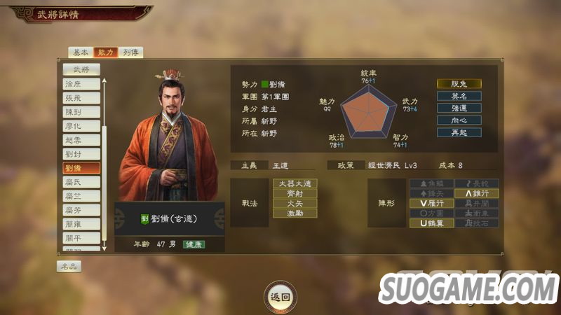而刘备的义弟,同时也是三国志中最英勇善战的张飞,则拥有强力的固有个性「斗将」,战斗时即便数个敌方部队接近,也不会受到包围效果的影响。还有像是不能无视接近自己的敌方部队的负面个性「莽撞」,也充分表现出张飞另一面性格。