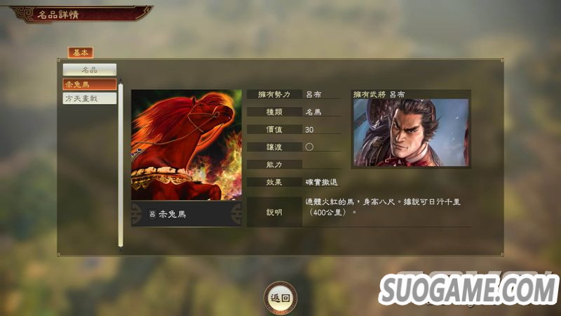 除了武将的个性之外,点缀三国志世界的要素之一「名品」也会于本作登场。曹操所编着的兵法书「孟德新书」、以一日千里闻名的「赤兔马」等与武将有关的各种宝物都会登场。「名品」不仅可以提升武将的能力并发挥特殊效果,若将「名品」授予下属武将,还可提升该名武将的忠诚度。「名品」在经营势力上的重要性不容小觑。