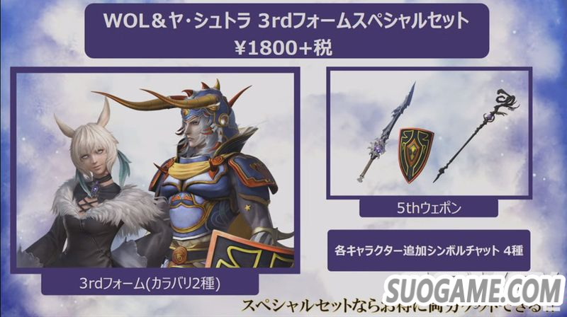 雅·修特拉的新服装与武器取自《最终幻想14 暗影之逆焰》中的作为“魔女”职业的新造型,而初代光之战士的新服装则是来自由天野喜孝绘制的《最终幻想1》角色立绘,新武器出自PSP版《最终幻想1》中的新增武器,跟之前的DLC一样拥有三种不同的配色。这些DLC将于北京时间12月5日登陆PS4与PC平台,雅·修特拉新服装套装跟以前一样售价为1500日元,光之战士新服装套装售价为500日元,两个DLC打包购买的价格为1800日元。