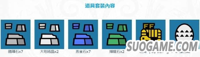 可在游戏初期大派用场的武器生产素材和换金道具组合!道具套装包含可生产和强化矿石素材衍生武器的素材以及换金道具。相信对刚开始《Monster Hunter: World》的新玩家特别有帮助。