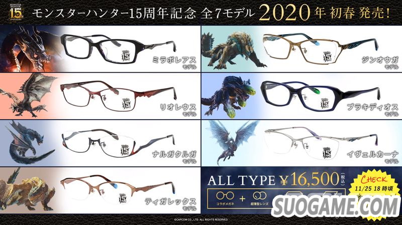 而《怪物猎人》15周年纪念系列眼镜也预计于2020年春季推出。种类包括:黑龙、雄火龙、迅龙、轰龙、雷狼龙、碎龙以及冰咒龙。