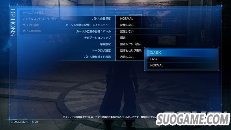 将难度调为「CLASSIC」,便会进入CLASSIC模式。在CLASSIC模式中,角色会自动行动,行动期间会累积ATB量表。因为玩家在战斗时只需要选择能力、 魔法、 道具等消耗ATB的指令,可以在充满临场感的游戏画面中重温彷彿原作『FFVII』 的指令式战斗。另外,即使在CLASSIC模式中,只要按下无线控制器的按钮,随时都能任意操作角色。