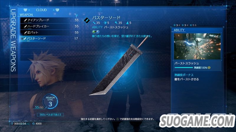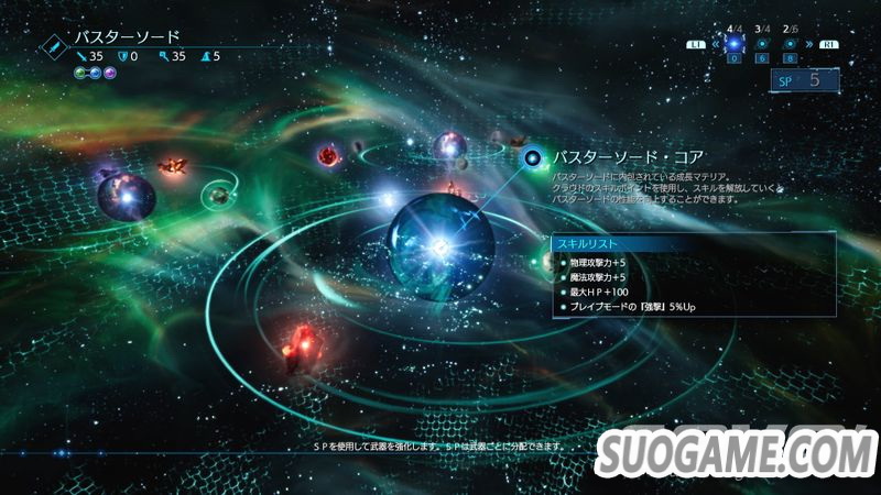 这是克劳德的武器「毁灭剑」的强化画面。可以强化角色的状态,也能扩张魔晶石槽。