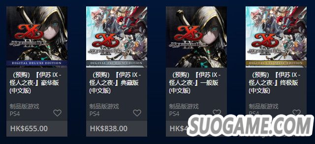 PS4游戏《伊苏9 怪人之夜》的繁体中文版已经在港服PS商店开启预购,其中普通版定价468港币,而最昂贵的终极版整整1000港币。
