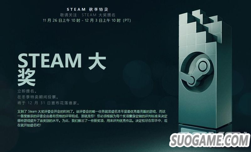同时开启的还有今年的「STEAM大奖」,你可以在Steam上为年度最佳游戏等8个奖项进行提名投票,12月31日宣布投票结果。投票网页版地址点此进入。