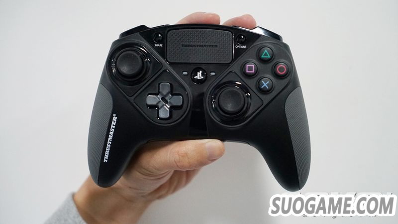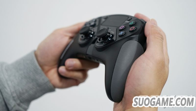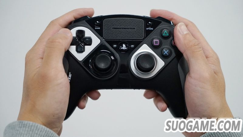 说到手感,eSwap本体重308g,明显高于Dualshock 4的210g,所以当你握在手中时,可以明显感觉到一个重量的增持。这是一种压手的感觉,握得更稳而不是单纯的沉。从外形上来看,eSwap的轮廓明显倾向于Xbox手柄,体积大于普通PS4手柄,这可能也会是带来手感差异的一个原因。