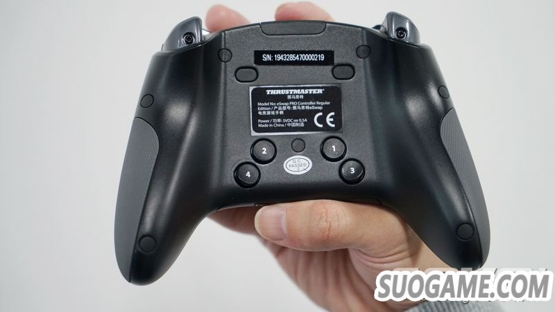相对于普通手柄,背部区域多了四个快捷按键。对于定制类手柄这不新鲜,背部几乎是可以有效利用的最佳空间。比较特别的是这个地方的按键没有跟随精英手柄系采用拨片,而是比较传统的按钮。当你握住手柄时,中指和无名指分别落在两组按钮上。我觉得这个地方采用按钮的一个主要考量是减免误触,毕竟连精英手柄自己的拨片也有误触问题,按钮相对于拨片的误触几率要更低。