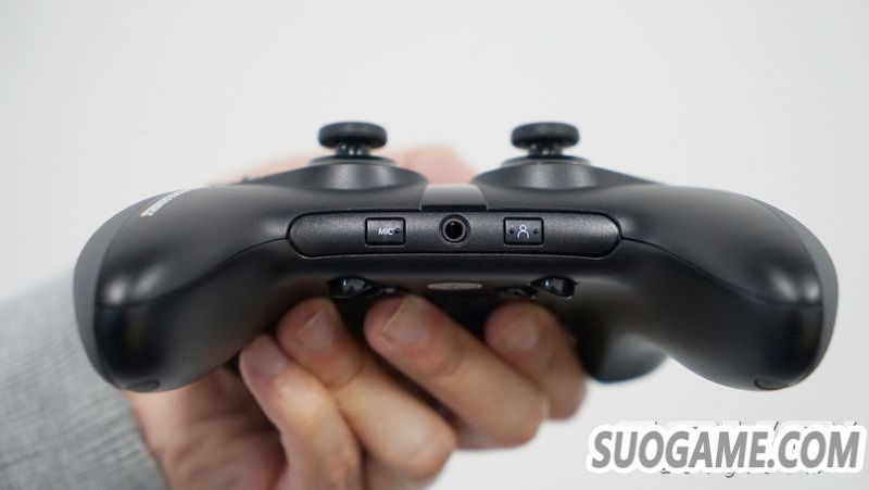 接下来是手柄底部,相对于普通手柄多了两个功能按钮:左侧的MIC是开关麦,右边的人形图标则是切换配置方案(也就是手柄正面那两个指示灯所代表的作用)