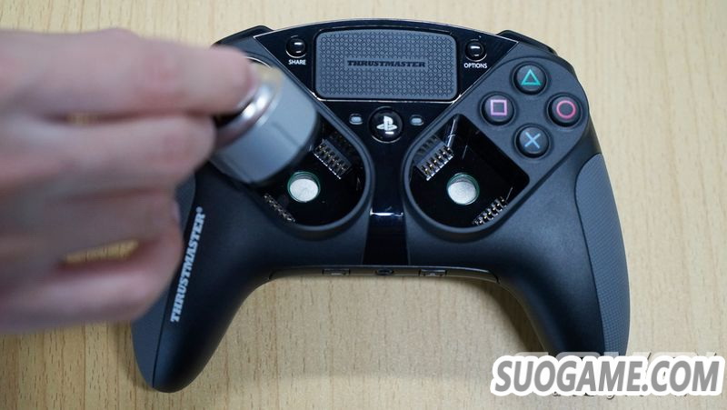 eSwap正面最突出的模块是中间的触控面板和PlayStation键,当然这也是得到索尼官方授权的标志。手柄在按键布局和样式上基本与Dualshock 4相同,两大功能键分别使用Share和Options标注,而右侧主键位也是PS系的图形标志;手柄的摇杆区默认采用对称设计,当然这一点其实并无所谓,因为你可以将这三个部位的套件(左右摇杆+十字键)随意更换调整。