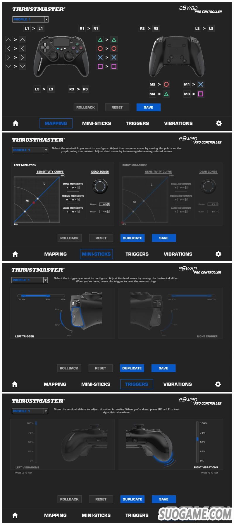 软件中设计了四大选项,包括摇杆和扳机的敏感度都可以进行大幅度更改;比较特别的一项是可以调整手动震动马达的等级,调到最大测试一下,手柄跟振动棒似的。最终调试好后可以存储为两个方案,在使用过程中通过手柄底部的按键无缝切换。