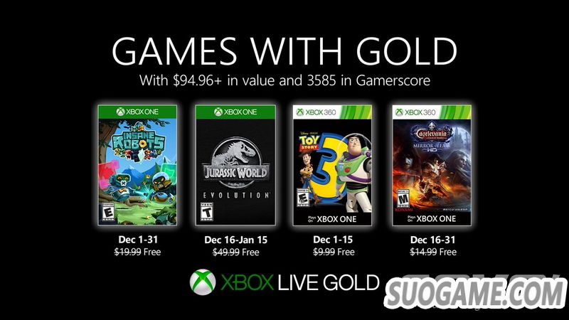 Xbox今日公开了2019年12月Xbox Live金会员会免游戏阵容:
