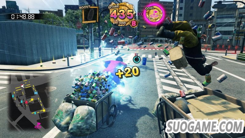 此外,如果捡到营养饮料并使用,将变为能在数秒内高速奔驰的冲刺状态。使用冲刺赶往终点或闪避撞过来的其他流浪汉, 设法取得高分吧。