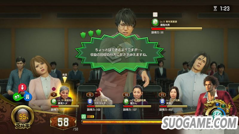 持续营业后,将会定期性召开「股东大会」。股东大会是面对抱有不满的股东,通过股东答疑让他们满意的论战对决游戏。如果能充分反驳股东们的发言,令其感到满意,股东们的支持率就会上升。请争取过半数的支持, 让股东大会成功吧。