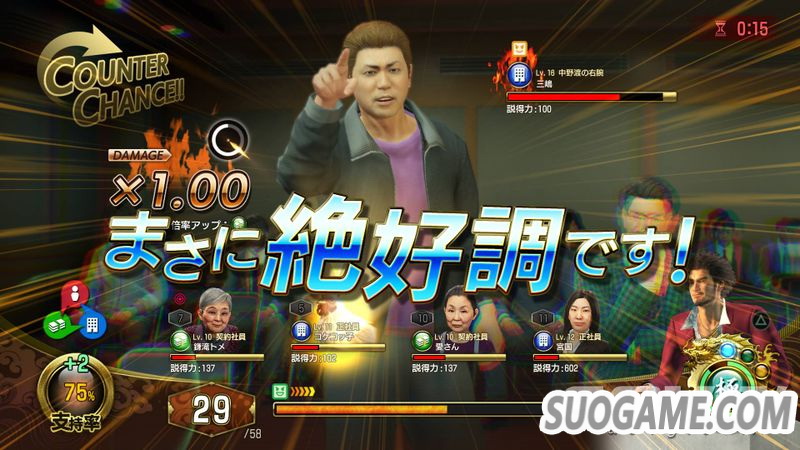 ▲处于反驳立场的员工,也具备人、物、 钱的属性,若能以适性较佳的属性来反驳,就可以用更少的攻击次数破坏对话框。 请思考目前拥有的成本和员工发动攻击所需的成本来拟定战略吧。 对话框被破坏的股东会暂时陷入毫无防备状态,此时由员工进一步发动反驳攻击,即可削弱股东的斗志(体力)。股东斗志归零就不会再攻击,借此可使股东大会的进行更加有利。