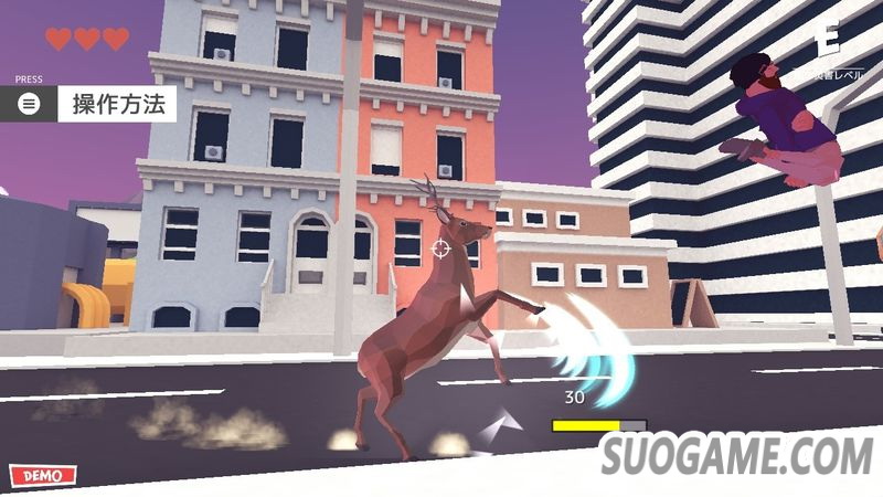 这只「非常普通」的鹿哥是两脚行走又能随意伸缩脖子,又可以利用鹿角做利器,完全是一只独特有个性的鹿在街上横行霸道。简单介绍本游戏的话,《非常普通的鹿》是要在这"慢生活城市中大肆破坏的游戏"。
