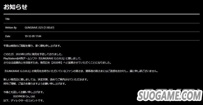 IGGYMOB宣布原定于2019年12月发售的PS4游戏《铳墓GORE》为了提升游戏品质将延期到2020年。