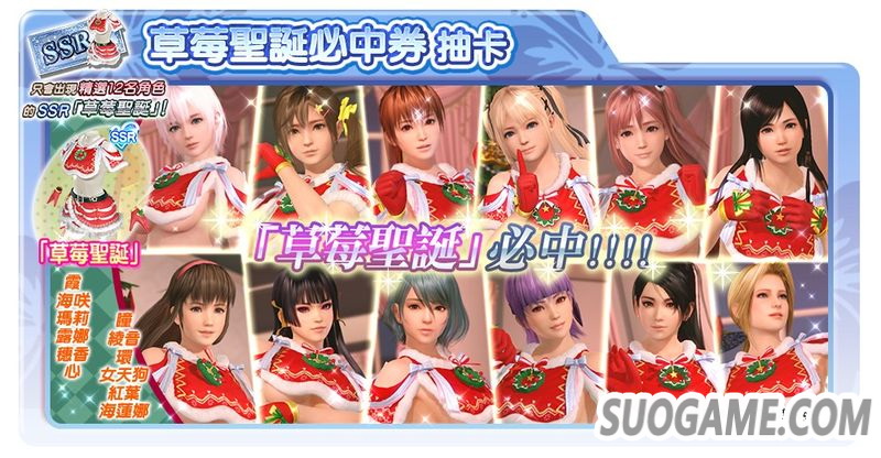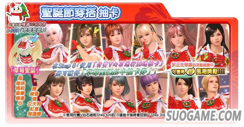 本日开始的「圣诞节穿搭抽卡」为 Step 变化抽卡。本抽卡中 SSR 泳装仅会出现新SSR 泳装「草莓圣诞」;每进行 1 回 10 连抽卡即可进入下一 Step,共分为 6 Step, 第 6 Step 使用付费 V 心石进行 10 连抽卡还可额外获得「草莓圣诞必中抽卡券」。