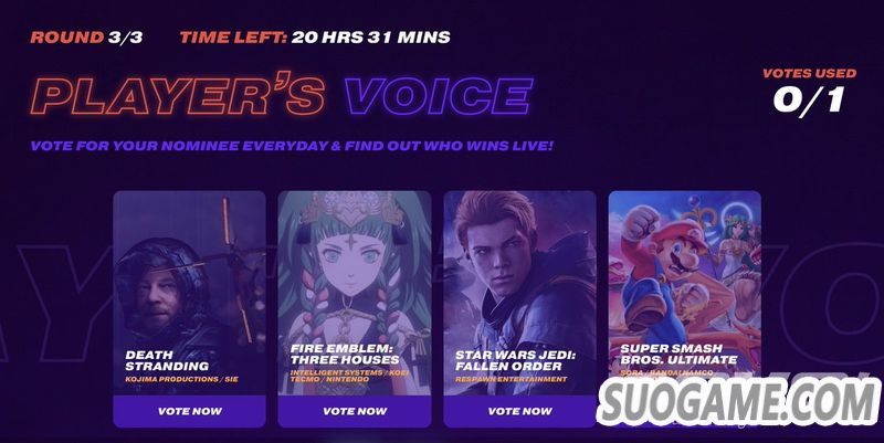 TGA的“玩家之声”已经进入最后一轮的角逐,剩下的四款游戏是《死亡搁浅》《任天堂明星大乱斗 特别版》《火焰纹章 风花雪月》《星球大战绝地 陨落的武士团》,《风花雪月》目前以41%的得票率暂时领跑,投票还在继续中。