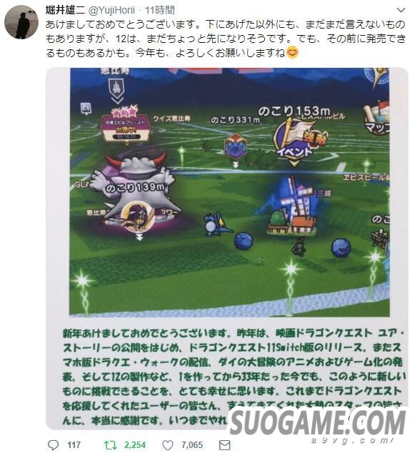 「新年快乐。去年从电影「勇者斗恶龙 YOUR STORY」的公布并上映开始,还推出了Switch版的「勇者斗恶龙Ⅺ 寻觅逝去的时光S」、手机游戏「勇者斗恶龙Walk」、「勇者斗恶龙 达伊大冒险」的新动画与新游戏。并且在2019年也开始了「勇者斗恶龙12」的制作,从初代开始到了现在已经过了33年,如今还能尝试这种新挑战真的是一件非常幸福的事。非常感谢至今为止一路支持我们过来的玩家,也非常感谢我们的开发人员。我还不知道我能做到几岁,不过我希望能够继续在拼几年。希望大家能过一个好年,新的一年也请多关照!」