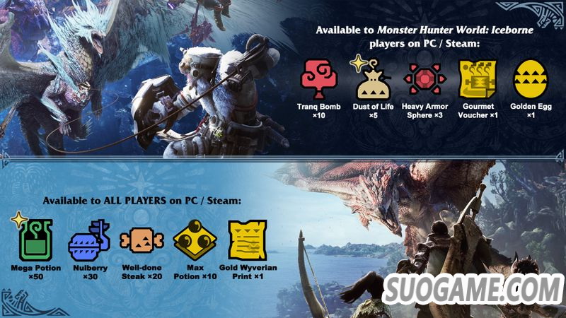 Capcom今日宣布为纪念《怪物猎人世界 Iceborne》Steam版发售,将为所有Steam版玩家配信一组纪念道具礼包,其中包括:回复药大x50,打消果实x30,烤熟肉x20,秘药x10以及金之龙人票x1。对于购买了《Iceborne》的玩家还可以获得一份额外的礼包,其中包括:捕获用麻醉玉x10,生命大粉尘x5,重铠玉x3,高级餐券x1以及金蛋x1。礼包领取时间为背景1月9日~2月5日。