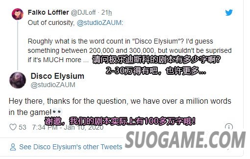 《极乐迪斯科》的荣誉与它的品质是直接关联的。而其所有优秀品质中,最具代表性的就是精彩、耐读、丰富的故事情节。那么拥有这些复杂故事情节的游戏,它的完整剧本到底有多大?有人在推特上这么问道。官方回答说:嗨!也就100多万字吧。